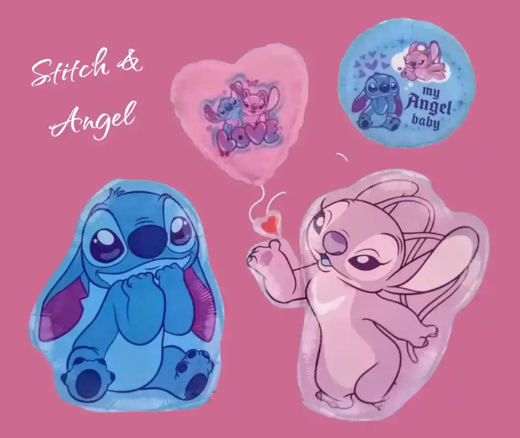 Bouquet X4 Globos Metálizados Stitch y Angel •1 Globo Angel 60x67cm •1 Globo Stitch 62x48cm •1 Globo Redondo 45x45cm •1 Globo Corazón 45x45cm Nota: •Los Globos vienen desinflados •Se pueden inflar con Helio