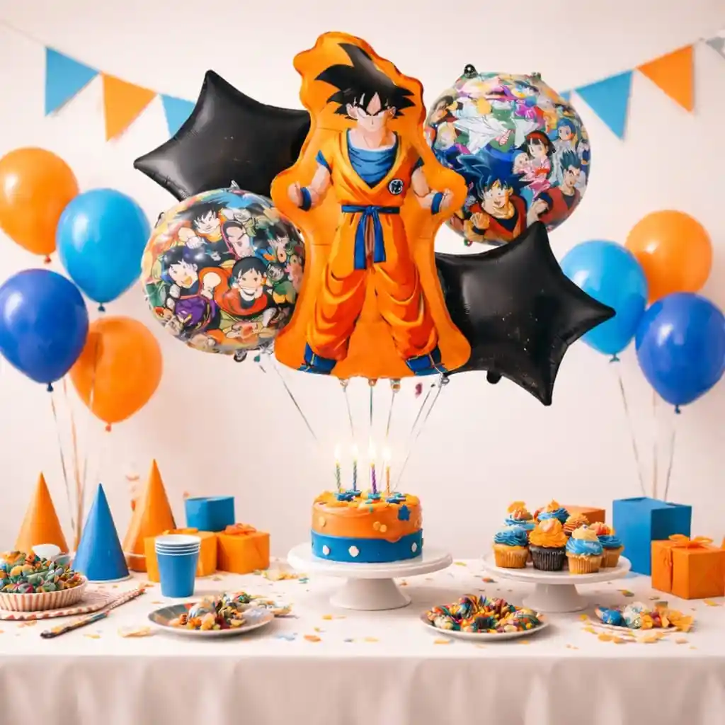 Haz que tu celebración sea épica con este bouquet de globos metalizados inspirado en Dragon Ball. Perfecto para decorar cumpleaños infantiles, fiestas temáticas o sorprender a un fan del anime. El set incluye globos con diseño de personajes y una figura central estilo Goku que se convierte en el protagonista de la decoración. Ideal para mesas de cumpleaños, sorpresas o ambientar la fiesta. Contenido del Set: * 1 globo metalizado grande personaje estilo Goku * 2 globos redondos con diseño Dragon Ball * 2 globos estrella negros. Perfecto para: * Decoración de cumpleaños infantil * Fiestas temáticas de anime * Mesas dulces o centros de mesa * Sorpresas para fans de Dragon Ball Importante: La compra incluye únicamente los 5 globos metalizados. El portaglobos, cintas, bases, pasteles u otros accesorios que aparecen en algunas imágenes son solo para ambientar la fotografía y no están incluidos. •Los globos se envían desinflados para su fácil transporte.