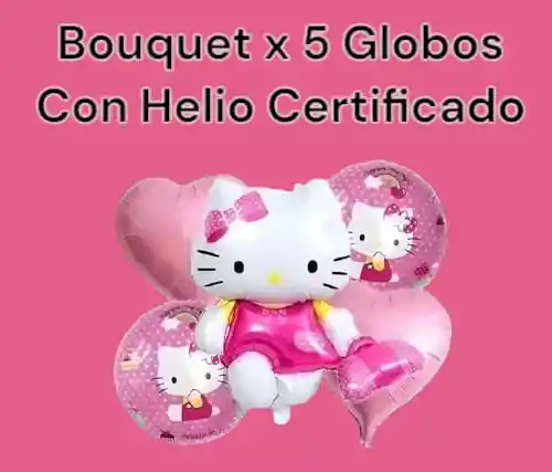 Este hermoso bouquet incluye: HELIO CERTIFICADO 1 globo metálico de Hello Kitty grande: La protagonista indiscutible, con su icónico lazo rojo y su sonrisa encantadora. 2 globos metálicos en forma de corazón: A juego con la temática, aportando un toque romántico y dulce. 2 globos de látex en colores pastel: Complementando la paleta de Hello Kitty, agregando volumen y armonía al conjunto. 1 globo hello Kitty 60cm 4 globos 45cm
