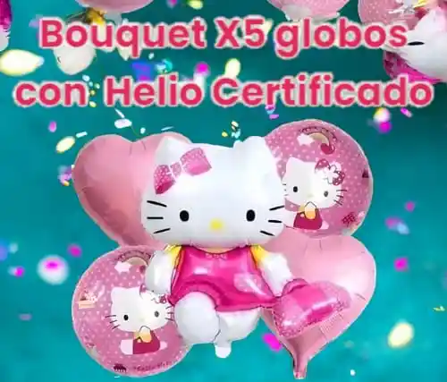 Este hermoso bouquet incluye: HELIO CERTIFICADO 1 globo metálico de Hello Kitty grande: La protagonista indiscutible, con su icónico lazo rojo y su sonrisa encantadora. 2 globos metálicos en forma de corazón: A juego con la temática, aportando un toque romántico y dulce. 2 globos de látex en colores pastel: Complementando la paleta de Hello Kitty, agregando volumen y armonía al conjunto. 1 globo hello Kitty 60cm 4 globos 45cm