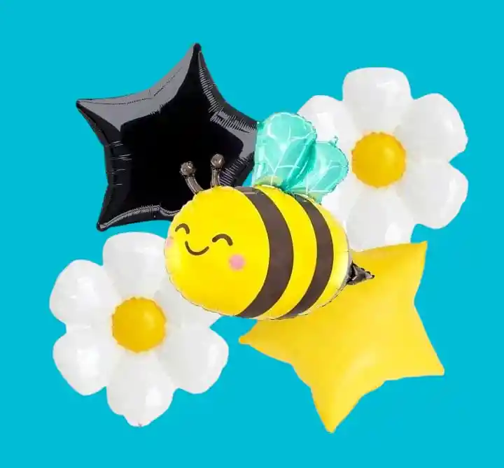 DECORA TU FIESTA Y VIVE UN MOMENTO INOLVIDABLE!! Por la compra llevas: •1 Globo Abejita (60x5cm) •2 Globos Flor 45x45cm C/U •2 Estrellas Metálizadas 45x45cm Nota Los Globos se envían Desinflados
