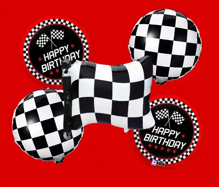 DECORA TU FIESTA Y VIVE UN MOMENTO INOLVIDABLE!! Por la compra llevas: •1 Globo Bandera de Meta (60x54cm) •4 Globos Redondo 45x45cm C/U Nota Los Globos se envían Desinflados