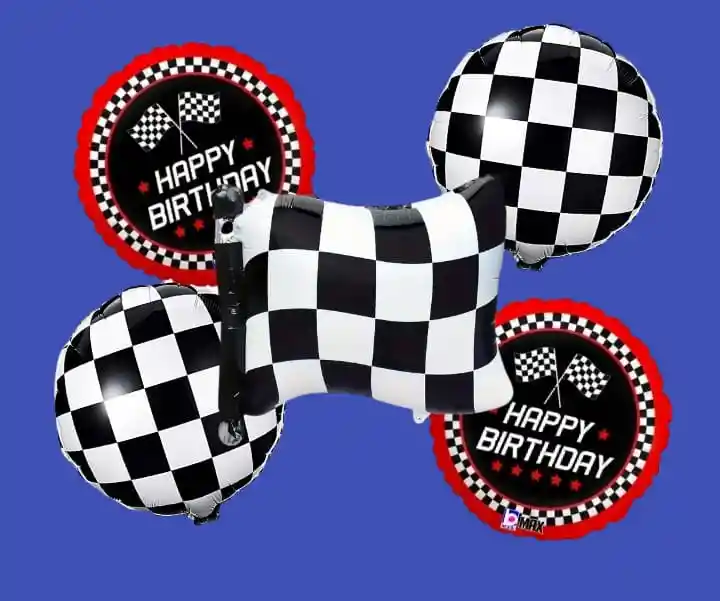 DECORA TU FIESTA Y VIVE UN MOMENTO INOLVIDABLE!! Por la compra llevas: •1 Globo Bandera de Meta (60x54cm) •4 Globos Redondo 45x45cm C/U Nota Los Globos se envían Desinflados