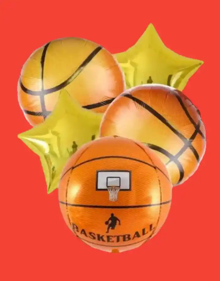 ouquet X5 Globos Metálizados Basketball •1 Pelota Basketball 55x55cm •2 Globos Estrella 45x45cm •2 Globos Redondos Balón 45x45cm Nota: •Los Globos vienen desinflados •Se pueden inflar con helio