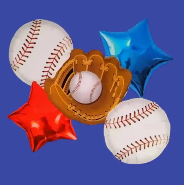 Bouquet X 5 Globos Metalizados BÉISBOL Por la compra llevas: •1 Globo Guante Béisbol MEDIDAS:50x50cm •2 Globos Redondos MEDIDAS:45x45cm/Cada uno •2 Globos Estrella MEDIDAS:45x45cm/Cada uno Nota •Se pueden inflar con Helio •Los Globos se entregan Desinflados