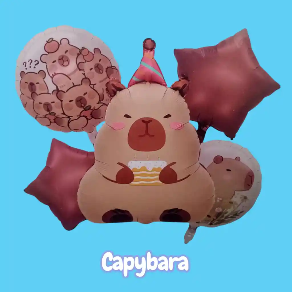 Bouquet X5 Globos Metálizados CapyBara •1 Globo Capybara 69x49cm •2 Globos Redondos 45x45cm •2 Globos Estrella 45x45cm Nota: •Los Globos vienen desinflados •Se pueden inflar con Helio