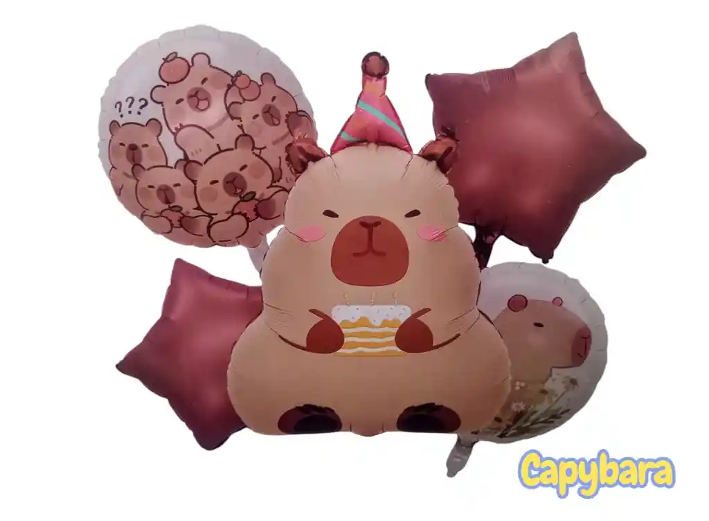 Bouquet X5 Globos Metálizados CapyBara •1 Globo Capybara 69x49cm •2 Globos Redondos 45x45cm •2 Globos Estrella 45x45cm Nota: •Los Globos vienen desinflados •Se pueden inflar con Helio