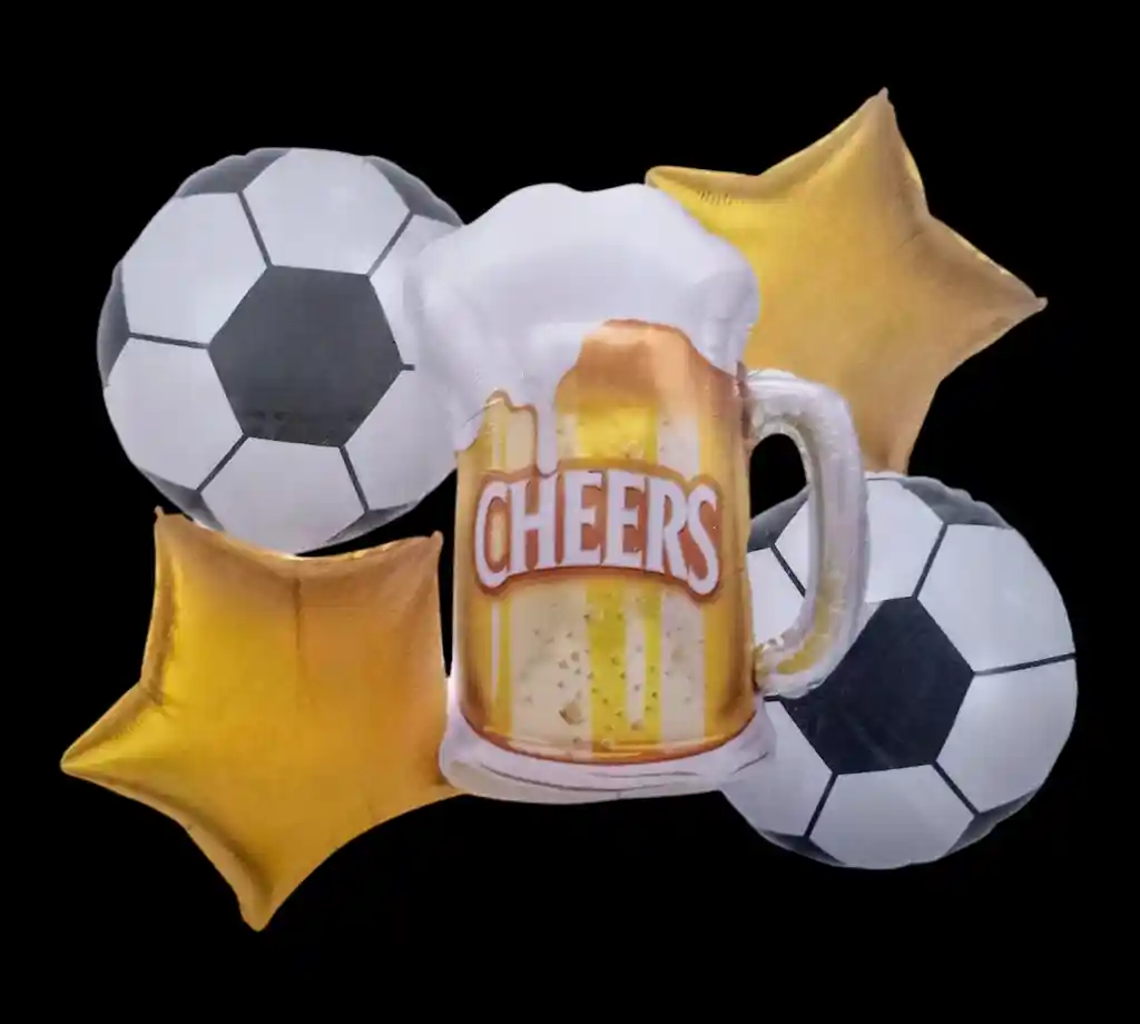 Bouquet X5 Globos Metálizados Cerveza Por tu Compra llevas: •1 Cerveza Grande 90x80cm •2 Globos Estrellas 45x45cm C/U •2 Globos Balón 45x45cm NOTA: •Los Globos se pueden inflar con Helio * Los Globos Se envían Desinflados