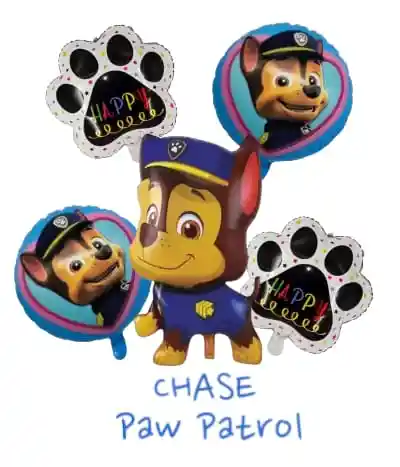 Bouquet X5 Globos Metálizados Chase Paw Patrol Por tu Compra llevas: •1 Perrito Chase 55x55cm •2 Globos Huellita 45x45cm C/U •2 Globos Redondo Paw Patrol 45x45cm NOTA: •Los Globos se pueden inflar con Helio •Los Globos Se envían Desinflados