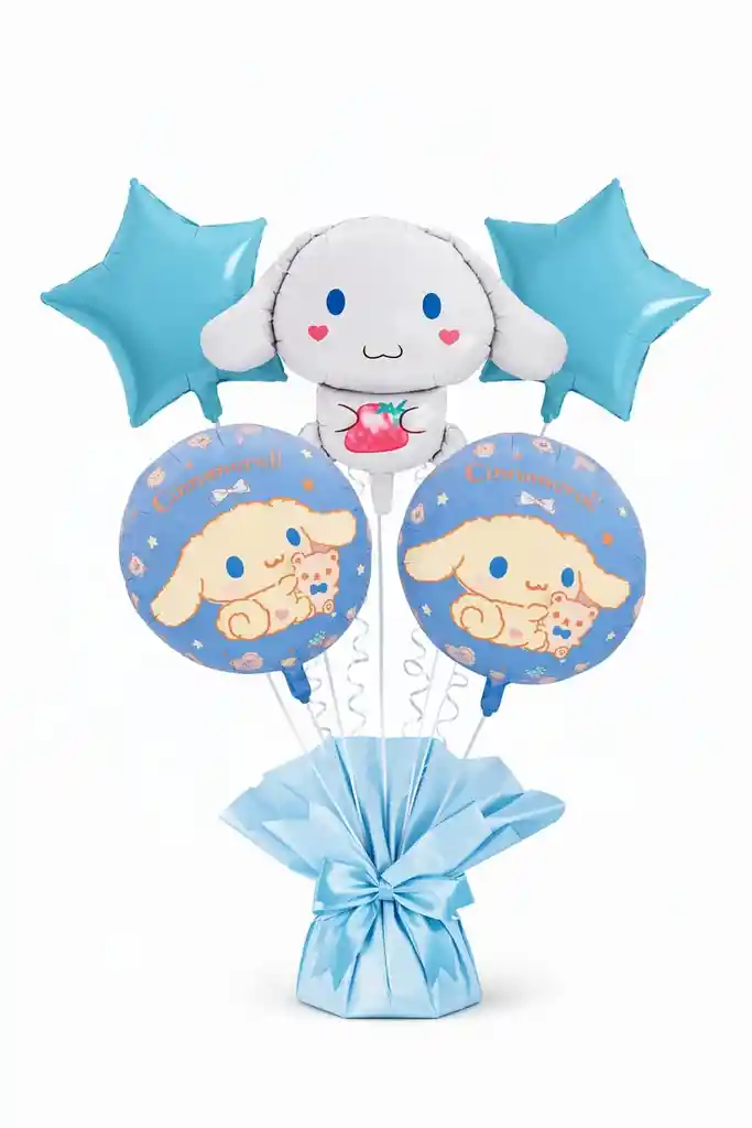 Bouquet X5 Globos Metalizados CINNAMOROLL SANRIO •1 Globo Metalizado Cinnamoroll: 65x65cm •2 Globos Metalizados Estrellas: 45x45cm •2 Globos Metalizados Redondos: 45x45cm TENER EN CUENTA: •Los Globos Metalizados vienen desinflados •Se pueden Inflar con Helio •El Bouquet incluye únicamente los 5 globos. •El portaglobos, mesa, pastel, regalos y demás accesorios que aparecen en la imagen son únicamente para ambientar la fotografía.
