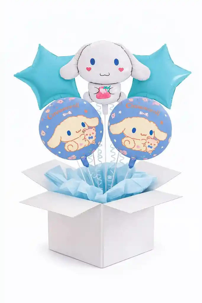Bouquet X5 Globos Metalizados CINNAMOROLL SANRIO •1 Globo Metalizado Cinnamoroll: 65x65cm •2 Globos Metalizados Estrellas: 45x45cm •2 Globos Metalizados Redondos: 45x45cm TENER EN CUENTA: •Los Globos Metalizados vienen desinflados •Se pueden Inflar con Helio •El Bouquet incluye únicamente los 5 globos. •El portaglobos, mesa, pastel, regalos y demás accesorios que aparecen en la imagen son únicamente para ambientar la fotografía.
