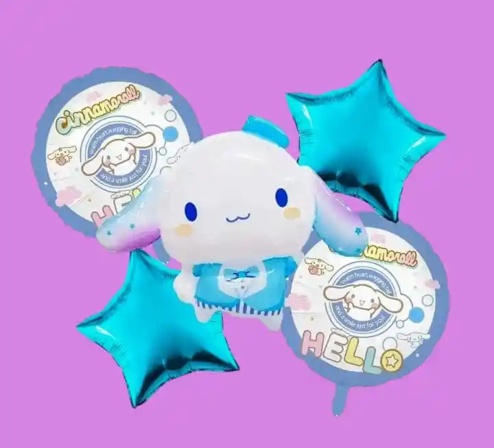 Bouquet X5 Globos Metálizados Cinnamoroll •1 Cinnamoroll 55x60cm •2 Globos Estrella 45x45cm •2 Globos Redondos 45x45cm Nota: •Los Globos vienen desinflados •Se pueden inflar con Helio