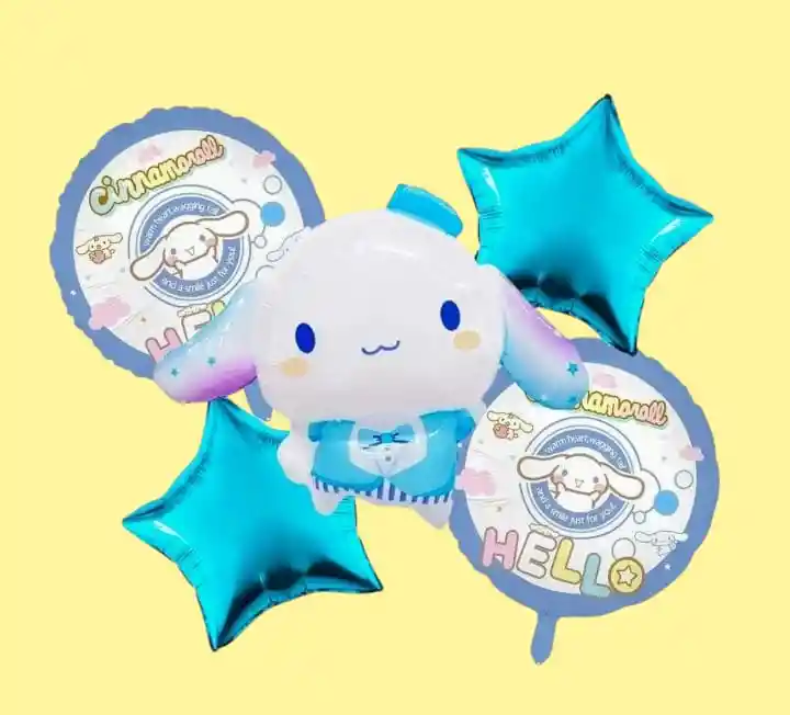 Bouquet x5 globos metalizados Por tu Compra llevas: •1 Globo Cinnamoroll: 60cm •2 Globos Estrella 45x45cm •2 Globos Redondo 45x45cm Tener en Cuenta: •Los Globos se envían Desinflados