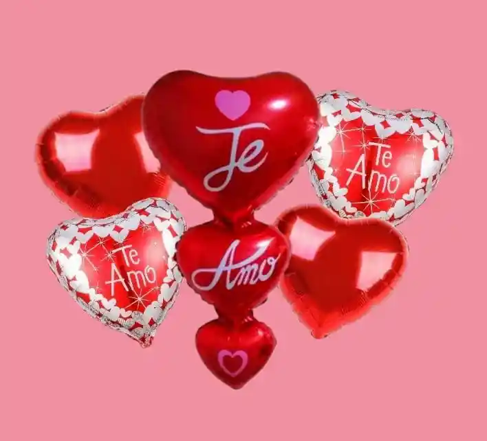 Bouquet X5 Globos Metálizados Corazónes Te Amo Por tu Compra llevas: •1 Globo Corazón Grande 98x50 cm •2 Globos Corazón Rojo 45x45cm c/u •2 Globos Corazon Estampado Te Amo 45x45cm c/u NOTA: •Los Globos se pueden inflar con Helio * Los Globos Se envían Desinflados