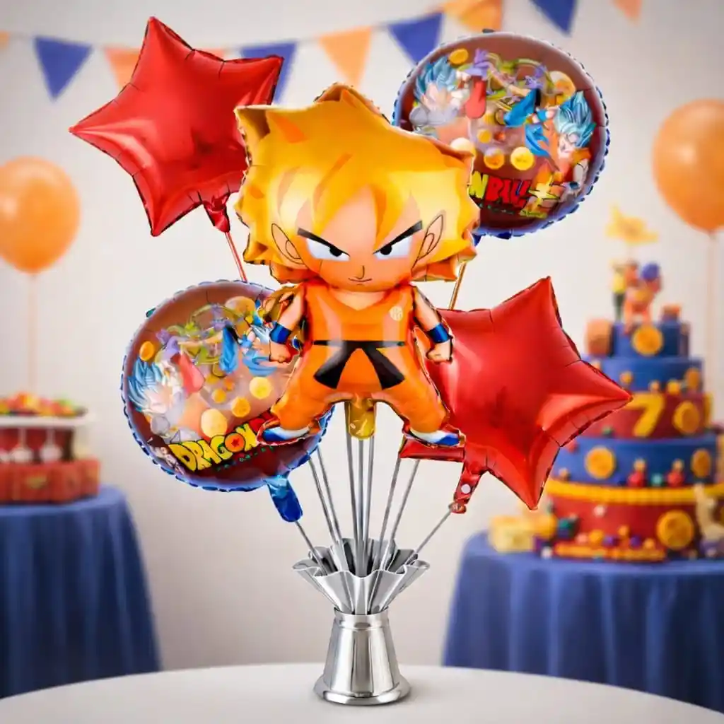 Bouquet de globos metalizados ideal para decoración de fiestas infantiles con temática anime. Incluye figura principal y globos complementarios en forma redonda y de estrella, perfectos para mesas principales, regalos sorpresa o decoración de cumpleaños. Colores vivos, acabado brillante y excelente presencia visual para fotos y ambientación de eventos. Incluye: •1 globo metalizado figura principal Gokú 60x45cm •2 globos metalizados redondos: 45x45 CM temáticos •2 globos metalizados estrella: 45x45 CM Importante: ⚠️ Los globos se entregan desinflados ⚠️ Solo incluye los globos, Otros elementos de ambientación en las imágenes no están incluidos ⚠️ Requieren aire o helio según el uso deseado