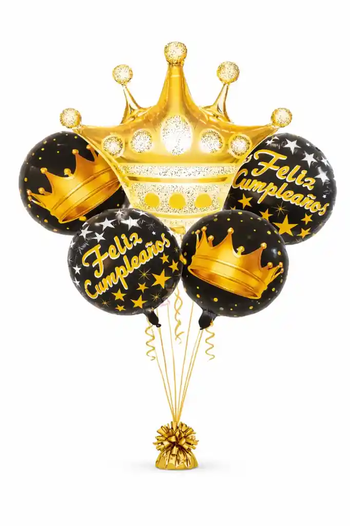 Bouquet x5 Globos Metalizados Corona Dorada Por la Compra llevas: •1 Globo Corona Dorada MEDIDAS:65x65cm •2 Globos Redondos MEDIDAS:45x45cm/Cada uno •2 Globos Estrellas MEDIDAS:45x45cm/Cada uno •Se pueden inflar con Helio •Los Globos se entregan desinflados