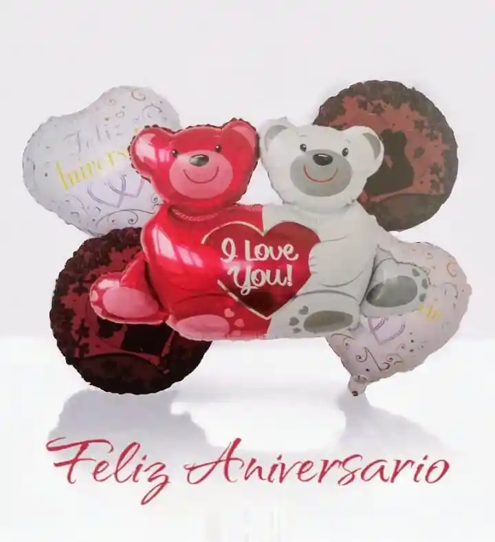 Bouquet x5 Globos Metalizados Feliz Aniversario Oso Love Por tu compra llevas: ●1 Globo Osos LOVE YOU: 76cmx100cm ●2 Globos Corazón: 45x45cm ●2 Globos Redondos Estampado:45x45cm Nota: ●Los Globos Metalizados se pueden inflar con aire normal y Helio ●Los Globos se entregan desinflados