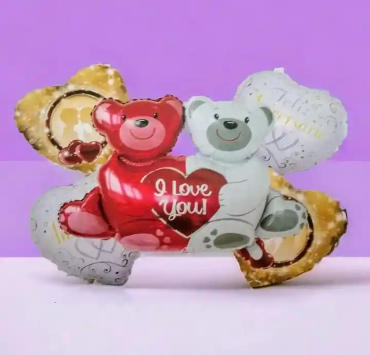Bouquet x5 Globos Metalizados Feliz Aniversario Oso Love Por tu compra llevas: ●1 Globo Osos LOVE YOU: 76cmx100cm ●2 Globos Corazón Blanco 45x45cm ●2 Globos Corazón Dorado:45x45cm Nota: ●Los Globos Metalizados se pueden inflar con aire normal y Helio ●Los Globos se entregan desinflados