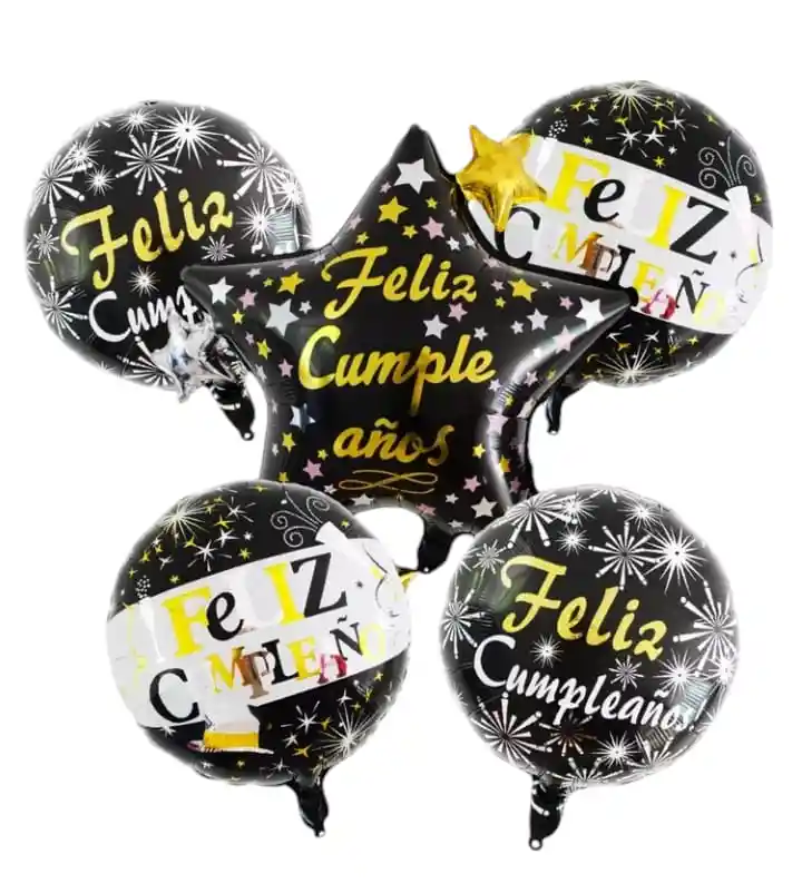 Bouquet X5 Globos Metálizados FELIZ CUMPLEAÑOS •1 ESTRELLA FELIZ CUMPLEAÑOS 55x55cm •4Globos Redondos 45x45cm Nota: •Los Globos vienen desinflados •Se pueden inflar con Helio