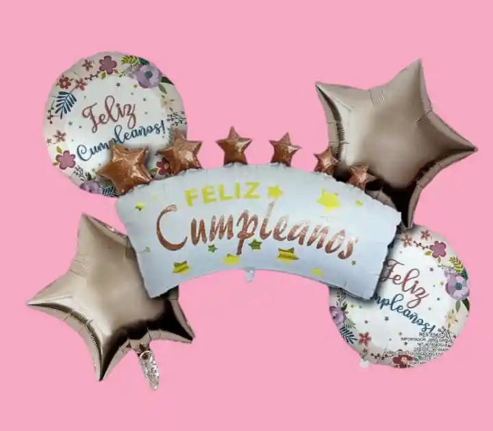 Bouquet X5 Globos Metálizados FELIZ CUMPLEAÑOS •1 Globo Feliz Cumpleaños 55x54cm •2 Globos Estrella 45x45cm •2 Globos Redondos 45x45cm Nota: •Los Globos vienen desinflados •Se pueden inflar con Helio
