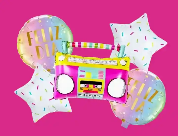 Bouquet x5 globos metalizados Por tu Compra llevas: •1 Globo Grabadora: 60x55cm •2 Globos Estrella 45x45cm •2 Globos Redondo 45x45cm Tener en Cuenta: •Los Globos se envían Desinflados