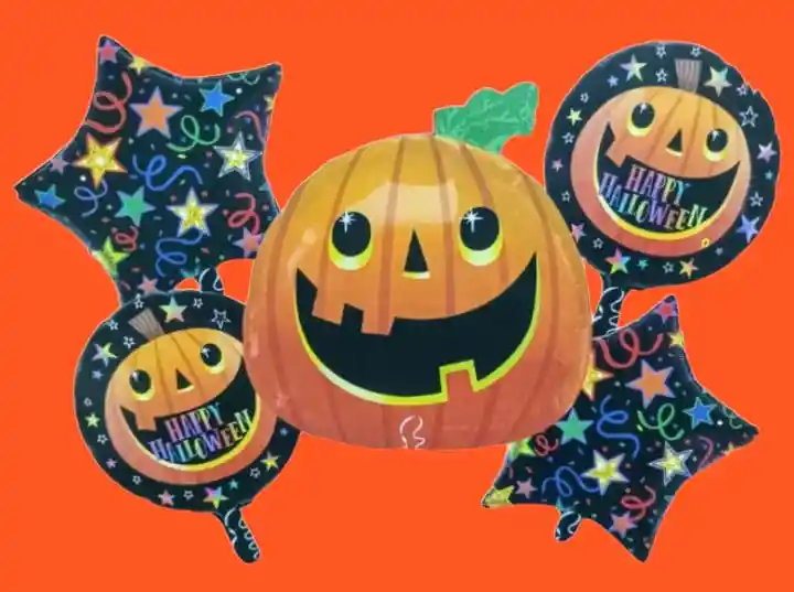 ¡Celebra Halloween con estilo con nuestro Bouquet metalizado por 5 Globos de Calabazas. Dale un toque festivo a tu decoración y sorprende a todos con esta brillante adición. ¡No te quedes sin el accesorio perfecto para tu fiesta de terror! Medidas: •1 Calabaza GRANDE: 70cm •2 Globos Estrellas :45X45cm •2 Globos Redondos Estampados:45X45cm NOTA -EL GLOBO SE PUEDE INFLAR CON HELIO -EL GLOBO TRAE AUTOSELLADO -EL GLOBO SE ENVIA DESINFLADO