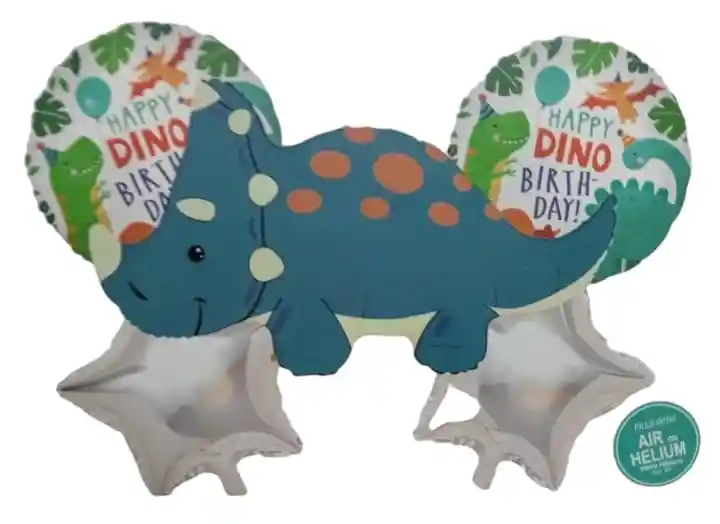 Bouquet X5 Globos Metálizados Feliz Cumpleaños Hello Dino •1 Hello Dino 99cmx55cm •2 Globos Estrella 45x45cm •2 Globos Redondos Balón 45x45cm Nota: •Los Globos vienen desinflados •Se pueden inflar con Helio