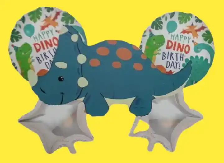 Bouquet X5 Globos Metálizados Feliz Cumpleaños Hello Dino •1 Hello Dino 99cmx55cm •2 Globos Estrella 45x45cm •2 Globos Redondos Balón 45x45cm Nota: •Los Globos vienen desinflados •Se pueden inflar con Helio