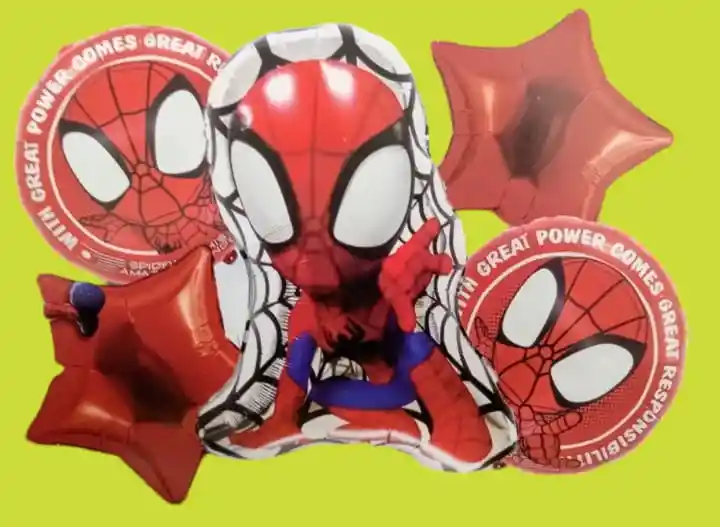 Globos Bouquet Metal 5 Pcs Hombre Araña Bouquet X5 Globos Metálizados Spiderman (Hombre Araña) •1 Spiderman (Hombre Araña) 72x48cm •2 Globos Estrella 45x45cm •2 Globos Redondos 45x45cm Nota: •Los Globos vienen desinflados •Se pueden inflar con Helio