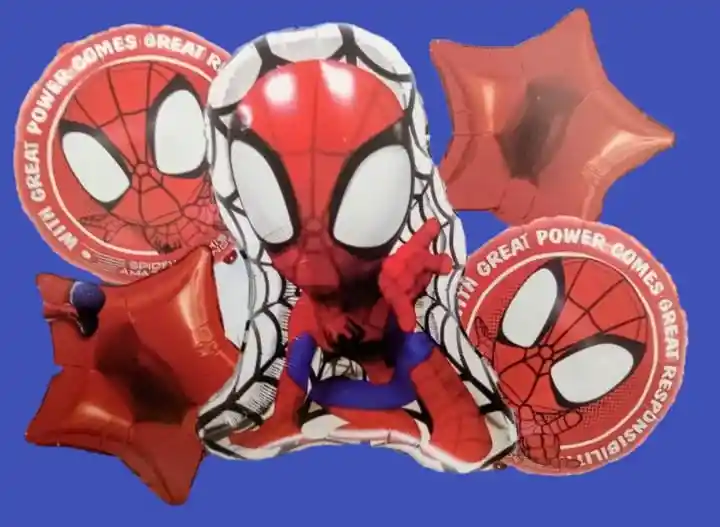 Bouquet X5 Globos Metálizados Spiderman (Hombre Araña) •1 Spiderman (Hombre Araña) 72x48cm •2 Globos Estrella 45x45cm •2 Globos Redondos 45x45cm Nota: •Los Globos vienen desinflados •Se pueden inflar con Helio