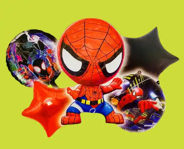 Bouquet X5 Globos Metálizados Baby Spiderman •1 Baby Spiderman 55x55cm •2 Globos Estrella 45x45cm •2 Globos Redondos 45x45cm Nota: •Los Globos vienen desinflados •Se pueden inflar con Helio