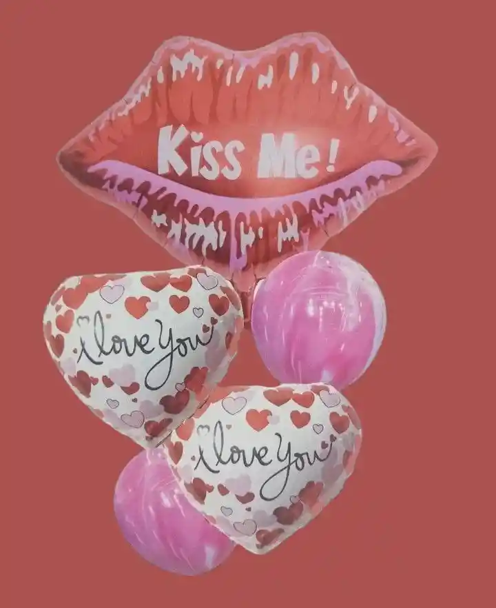 Bouquet X5 Globos Metálizados Por tu Compra llevas: •1 Labios Kiss Me 60x70cm •2 Globos Corazón 45x45cm C/U •2 Globos Latex 30cm c/u NOTA: •Los Globos se pueden inflar con Helio •Los Globos Se envían Desinflados