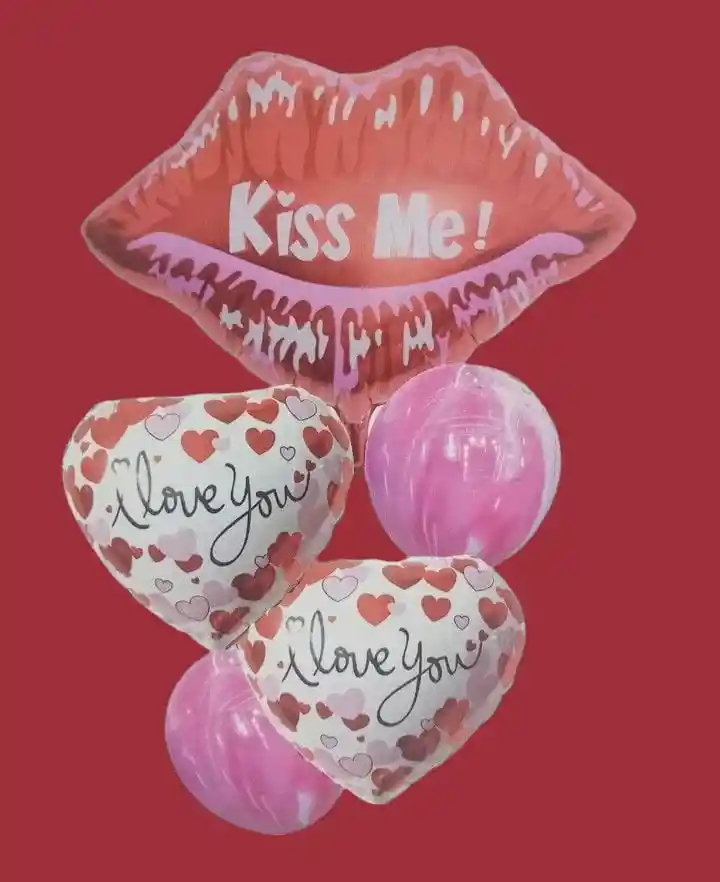 Bouquet X5 Globos Metálizados Por tu Compra llevas: •1 Labios Kiss Me 60x70cm •2 Globos Corazón 45x45cm C/U •2 Globos Latex 30cm c/u NOTA: •Los Globos se pueden inflar con Helio •Los Globos Se envían Desinflados
