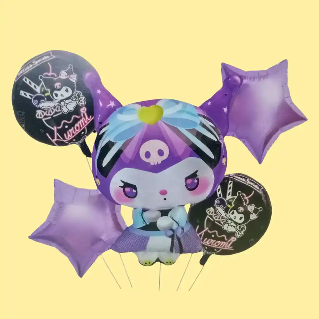 Bouquet X5 Globos Metálizados KUROMI •1 Globo kuromi 65x60cm •2 Globos Estrella 45x45cm •2 Globos Redondos 45x45cm Nota: •Los Globos vienen desinflados •Se pueden inflar con Helio