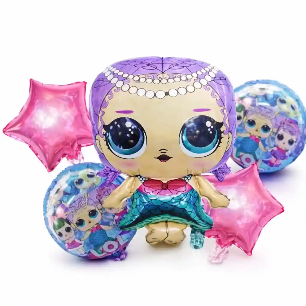 Bouquet X5 Globos Metalizados L.O.L SURPRISE PRINCESA! Por la compra llevas: •1 Globo Muñeca LOL SURPRISE MEDIDAS: 65x60cm •2 Globos Redondos MEDIDAS: 45x45cm/Cada uno •2 Globos Estrella MEDIDAS: 45x45cm/Cada uno •Los globos se pueden inflar con Helio •Los Globos se entregan desinflados