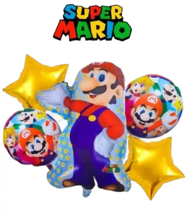 El "Bouquet X 5 Globos Metalizados con Diseño de Mario Bros" es un conjunto de globos decorativos diseñado especialmente para los fanáticos del icónico personaje de videojuegos Mario, de la serie Super Mario Bros. A continuación, te ofrezco una descripción detallada del producto: Globos Metalizados: Los globos están hechos de material metalizado de alta calidad, proporcionando un brillo atractivo y una durabilidad superior en comparación con los globos de látex convencionales. Diseño de Mario Bros: Cada globo presenta imágenes vibrantes y coloridas de Mario y otros personajes de la franquicia, como Luigi, la Princesa Peach, Yoshi, y Bowser. Los gráficos están impresos con alta resolución, capturando los detalles icónicos del universo de Mario. Cantidad: El bouquet incluye un total de 5 globos, ofreciendo una decoración completa y llamativa que es ideal para fiestas temáticas de Super Mario, cumpleaños, o cualquier evento especial. POR TU COMPRA LLEVAS: 1 MUÑECO DE MARIO BROSS :66X55CM 2 ESTRELLAS:45X45 CM 2 GLOBOS REDONDOS: 45X45CM NOTA LOS GLOBOS SE ENVIAN DESINFLADOS