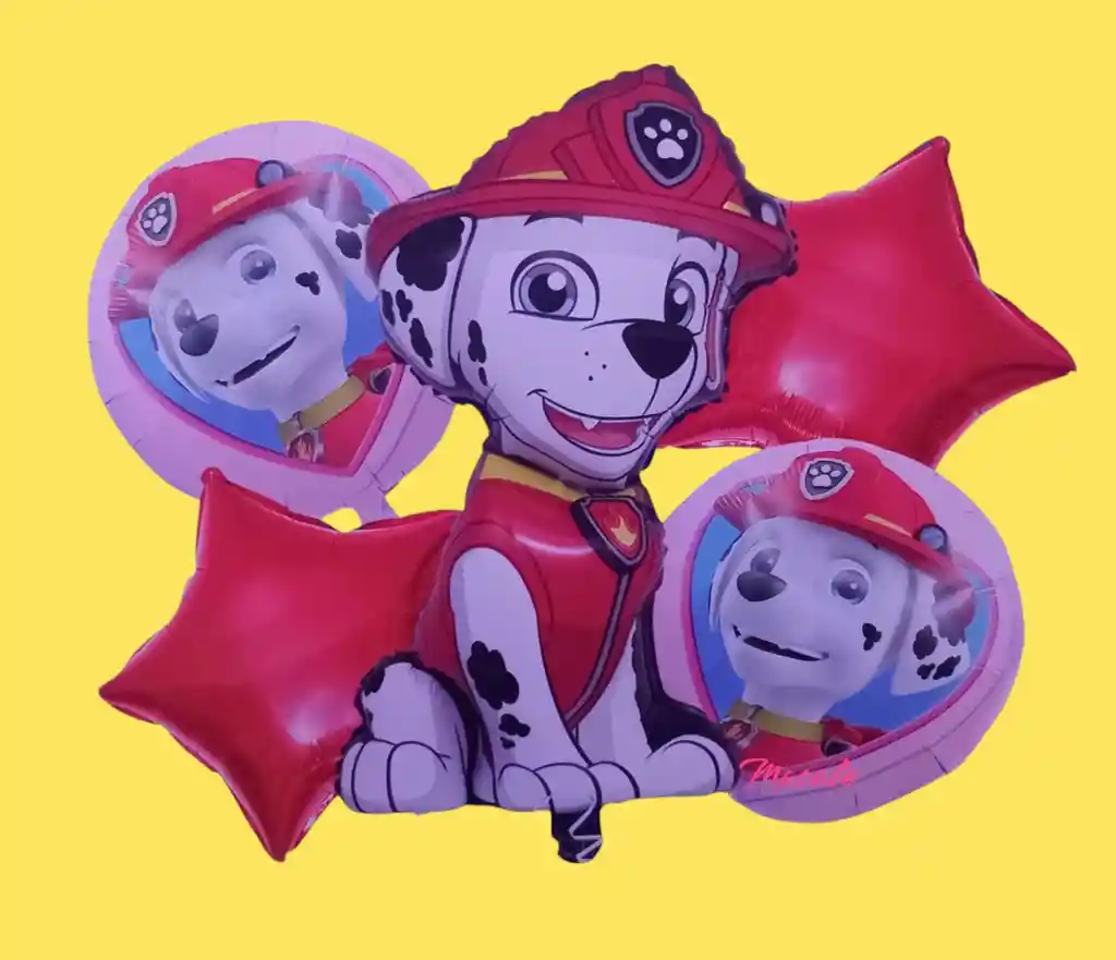 Bouquet X5 Globos Metálizados Marshall Paw Patrol •1 Globo Marshall 71x44cm •2 Globos Estrella 45x45cm •2 Globos Redondos 45x45cm Nota: •Los Globos vienen desinflados •Se pueden inflar con Helio