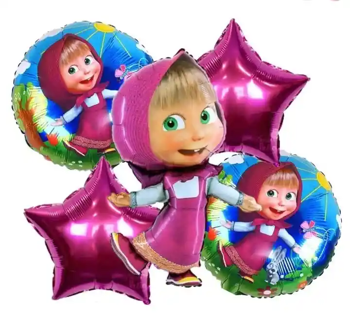 Por tu compra llevas: Bouquet x5 Globos Metalizados Masha y el Oso ●1 Globo Masha 70x55cm ●4 Globos metalizados 45x45cm Nota: ●Los globos se pueden inflar con Helio ●Los globos se entregan desinflados