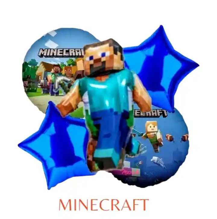 Bouquet X5 Globos Metálizados MINECRAFT •1 Globo MINECRAFT: 70x75cm •2 Globos Estrella 45x45cm •2 Globos Redondos 45x45cm Nota: •Los Globos vienen desinflados
