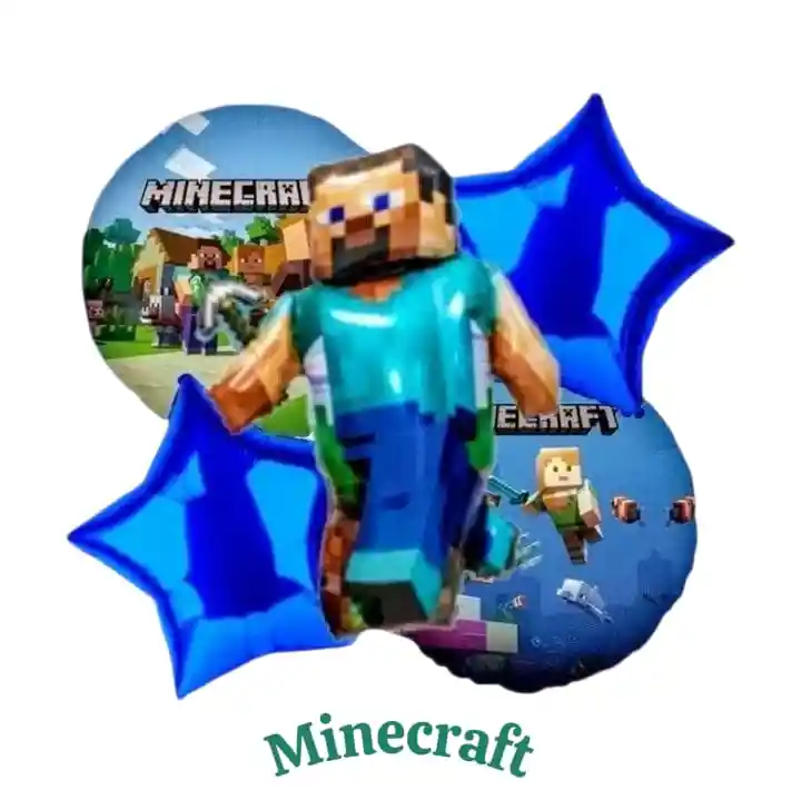 Bouquet X5 Globos Metálizados MINECRAFT •1 Globo MINECRAFT: 70x75cm •2 Globos Estrella 45x45cm •2 Globos Redondos 45x45cm Nota: •Los Globos vienen desinflados