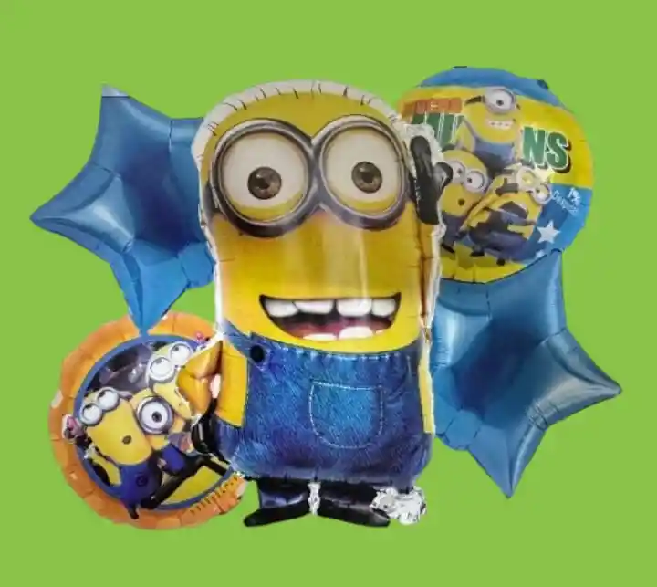 Bouquet X5 Globos Metálizados Minions •1 Minions 62x45cm •2 Globos Estrella 45x45cm •2 Globos Redondos 45x45cm Nota: •Los Globos vienen desinflados •Se pueden inflar con Helio