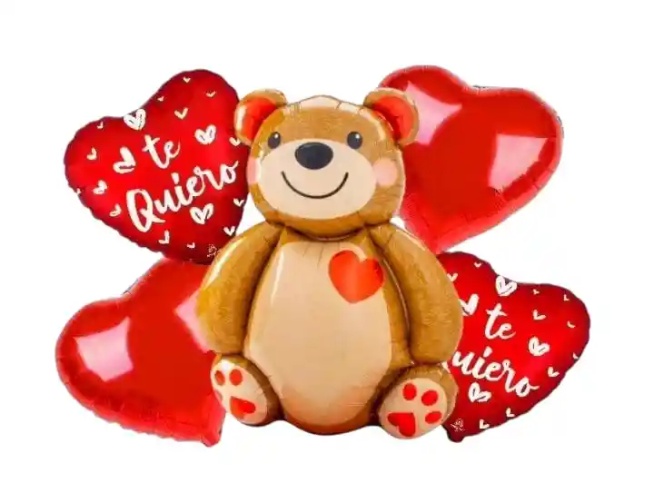 Set de 5 Globos Metalizados •1 Globo Oso Café 3D 91cm x 67 cm •2 Globos Corazón Estampado 45 cm x 45 cm •2 Globos Corazón de 45 cm x 45 cm -Los globos se pueden inflar con helio o con aire. Se venden desinflados.