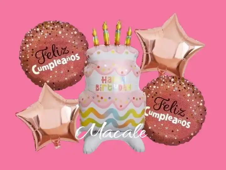Globos metalizados X5 unidades Pastel Feliz Cumpleaños Por la Compra llevas: •1 Pastel Medidas: Alto: 98cm Ancho: 75cm •2 Globos Corazones 45x45cm •2 Globos Redondo 45x45cm NOTA LOS GLOBOS SE ENVÍAN DESINFLADOS