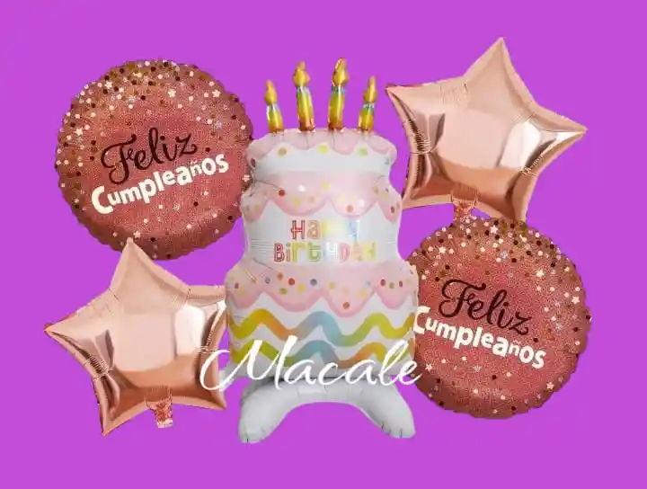 Globos metalizados X5 unidades Pastel Feliz Cumpleaños Por la Compra llevas: •1 Pastel Medidas: Alto: 98cm Ancho: 75cm •2 Globos Corazones 45x45cm •2 Globos Redondo 45x45cm NOTA LOS GLOBOS SE ENVÍAN DESINFLADOS