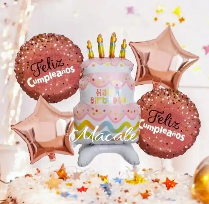 Globos metalizados X5 unidades Pastel Feliz Cumpleaños Por la Compra llevas: •1 Pastel Medidas: Alto: 98cm Ancho: 75cm •2 Globos Corazones 45x45cm •2 Globos Redondo 45x45cm NOTA LOS GLOBOS SE ENVÍAN DESINFLADOS