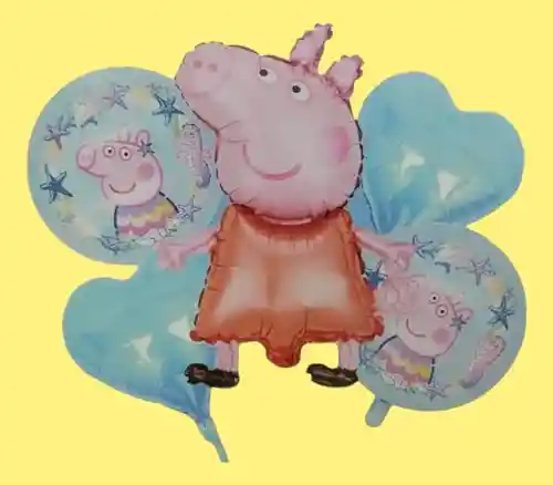 Por tu compra llevas: Bouquet x5 Globos Metalizados Peppa Pig ●1 Globo Peppa 60x50cm ●4 Globos metalizados 45x45cm Nota: ●Los globos se pueden inflar con Helio ●Los globos se entregan desinflados