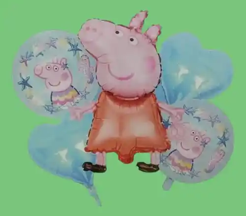 Por tu compra llevas: Bouquet x5 Globos Metalizados Peppa Pig ●1 Globo Peppa 60x50cm ●4 Globos metalizados 45x45cm Nota: ●Los globos se pueden inflar con Helio ●Los globos se entregan desinflados