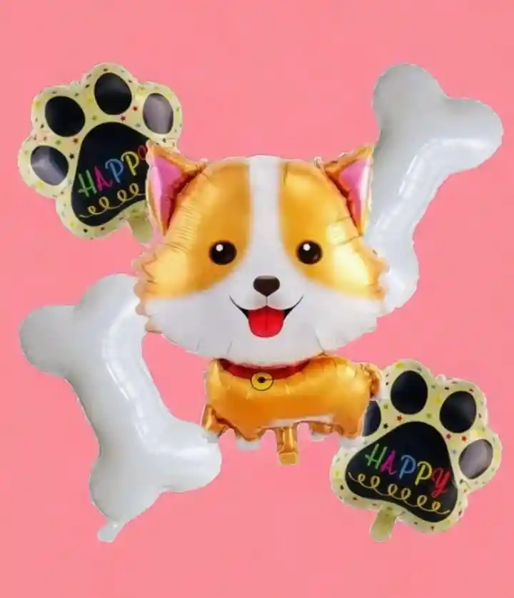Bouquet X5 Globos Metalizados Perrito Feliz * 1 Globo Metalizado 60x60 cm * 2 Globos Huellita 40x40cm * 2 Globos Huesitos 40x40cm Nota: •Los Globos se pueden Inflar con Helio •Los Globos se entregan Desinflados