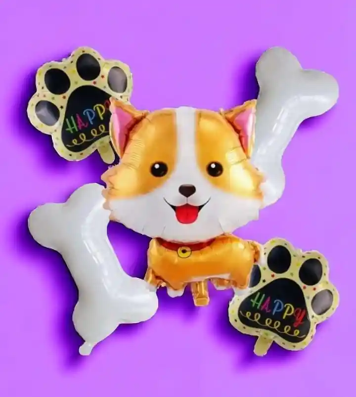 Bouquet X5 Globos Metalizados Perrito Feliz * 1 Globo Metalizado 60x60 cm * 2 Globos Huellita 40x40cm * 2 Globos Huesitos 40x40cm Nota: •Los Globos se pueden Inflar con Helio •Los Globos se entregan Desinflados