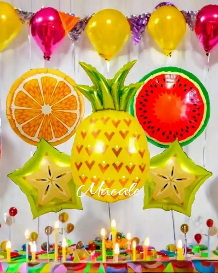 Globos metalizados X5 unidades Piña Tropical Por la Compra llevas: •1 Piña Grande Medidas: Alto: 98cm Ancho: 65cm •2 Globos Estrellas 45x45cm •2 Globos Redondo Naranja y Sandía 50x50cm NOTA LOS GLOBOS SE ENVÍAN DESINFLADOS